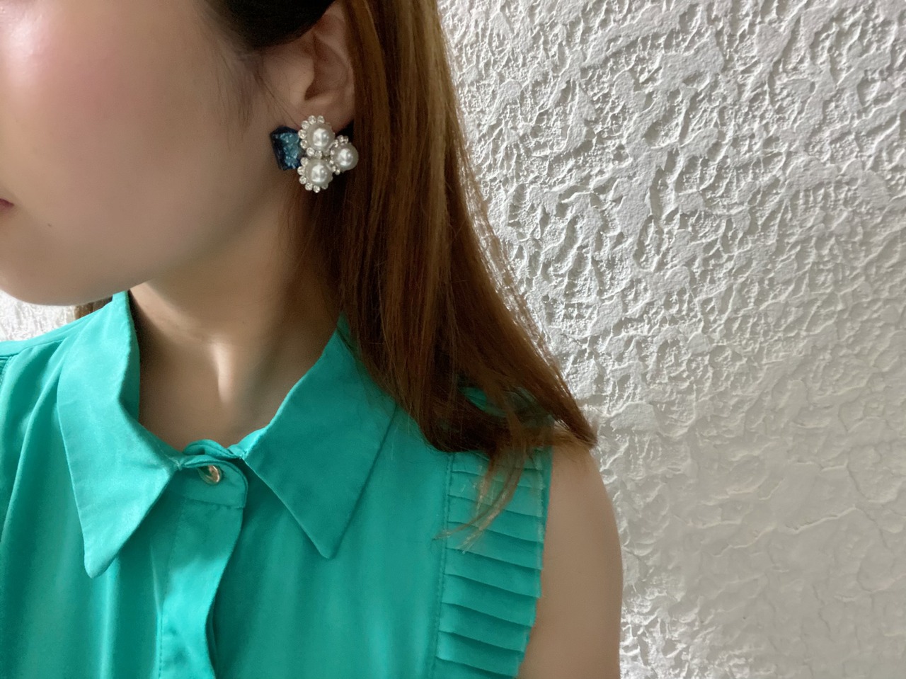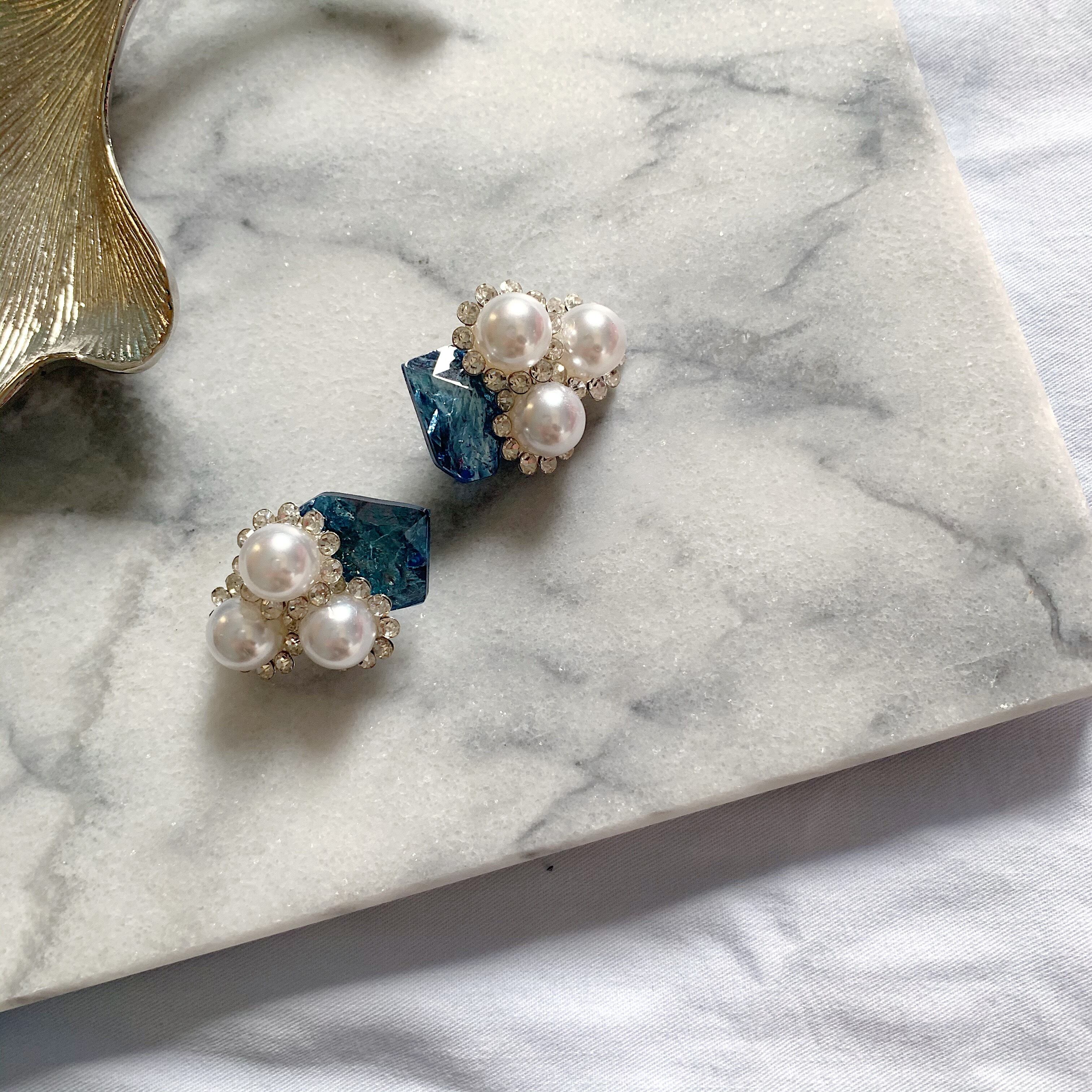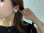 深みのあるblue bijouに3つのお花を合わせたアクセサリー。
